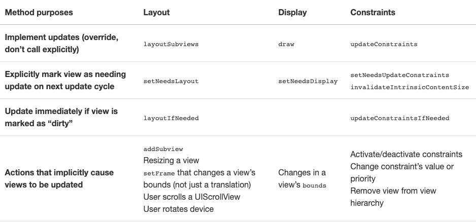 - layoutSubviews, draw와 같이 오직 오버라이딩 되어야 하며 명시적으로 호출되면 안된다.