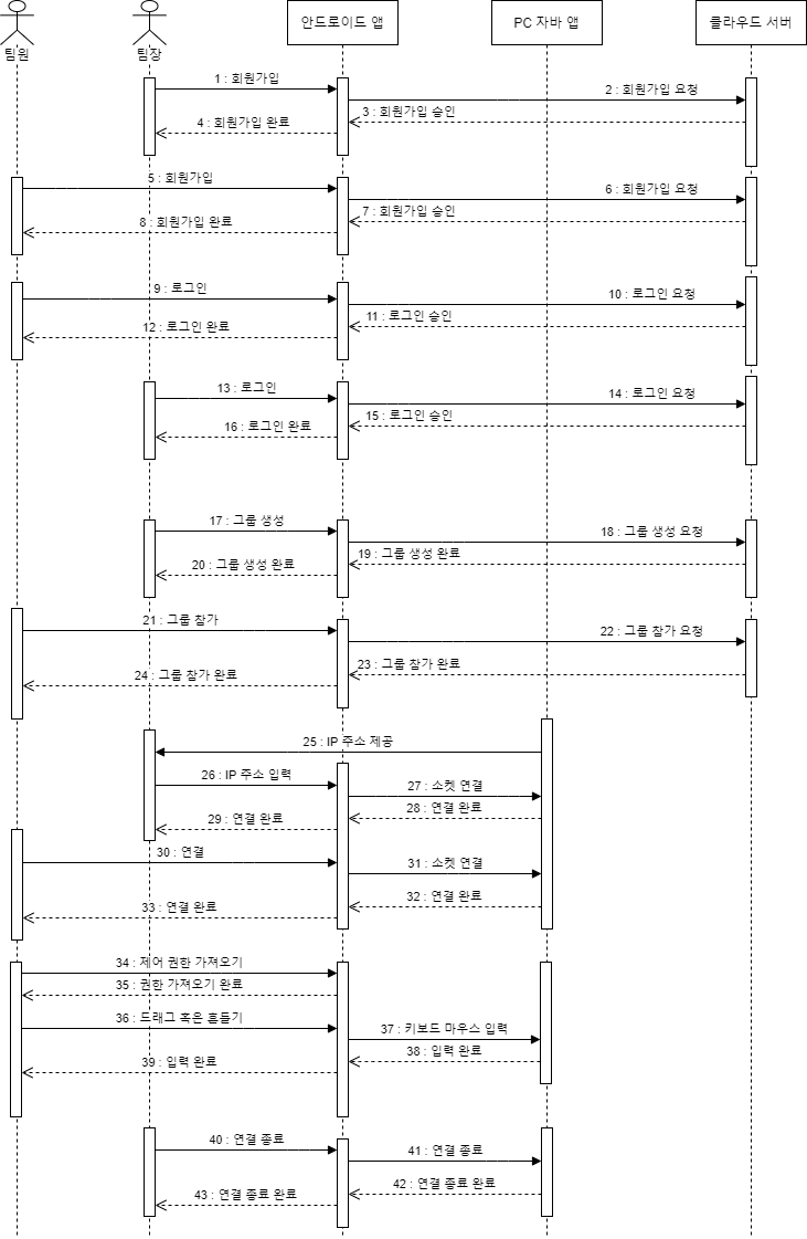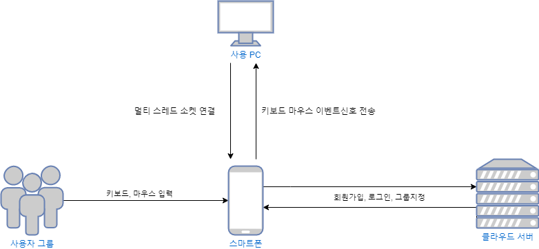 디벨롭된 아이디어는 일반적인 PC 리모컨이 아닌, '다수의 인원이 동시에 한 PC에 접속해서 제어할 수 있다'는 컨셉의 앱이었다. 백엔드를 도입해서 회원제로 운영하고 여러 인원을 그룹으로 지정해서 편하게 관리할 수 있는 기능을 추가했다.