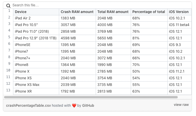 애플은 절되로 앱에 할당할 수 있는 구체적인 RAM budget의 양을 공개하지는 않지만, 해당 StackOverflow 포스트에서는 앱이 종료되지 않기 위한 안전한 메모리 사용량에 대한 경계값을 보여주고 있다.