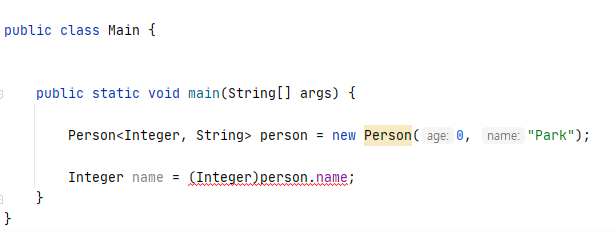 이번엔 Generic을 사용한 클래스를 보겠습니다. age와 name 속성의 타입을 각각 T1, T2라는 Generic 변수로 받아옵니다.