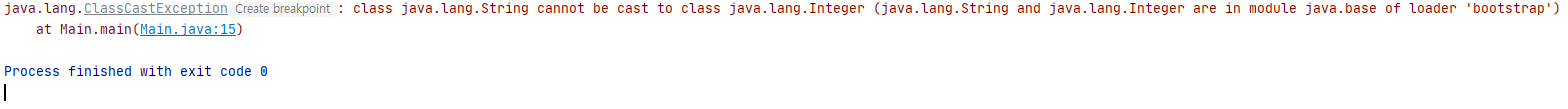 위의 코드는 작성단계에서는 오류를 발견할 수 없습니다. 하지만 String으로 넘긴 값을 Integer형으로 타입 캐스팅을 하려고 하기 때문에 실행 시 ClassCastException이 발생하게 됩니다.