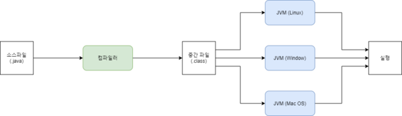 - 하지만 자바는 결과물이 운영체제에 종속되지 않고 자바 컴파일러가 생성한 바이트 코드를 JVM이 인식해서 실행하게 된다.
