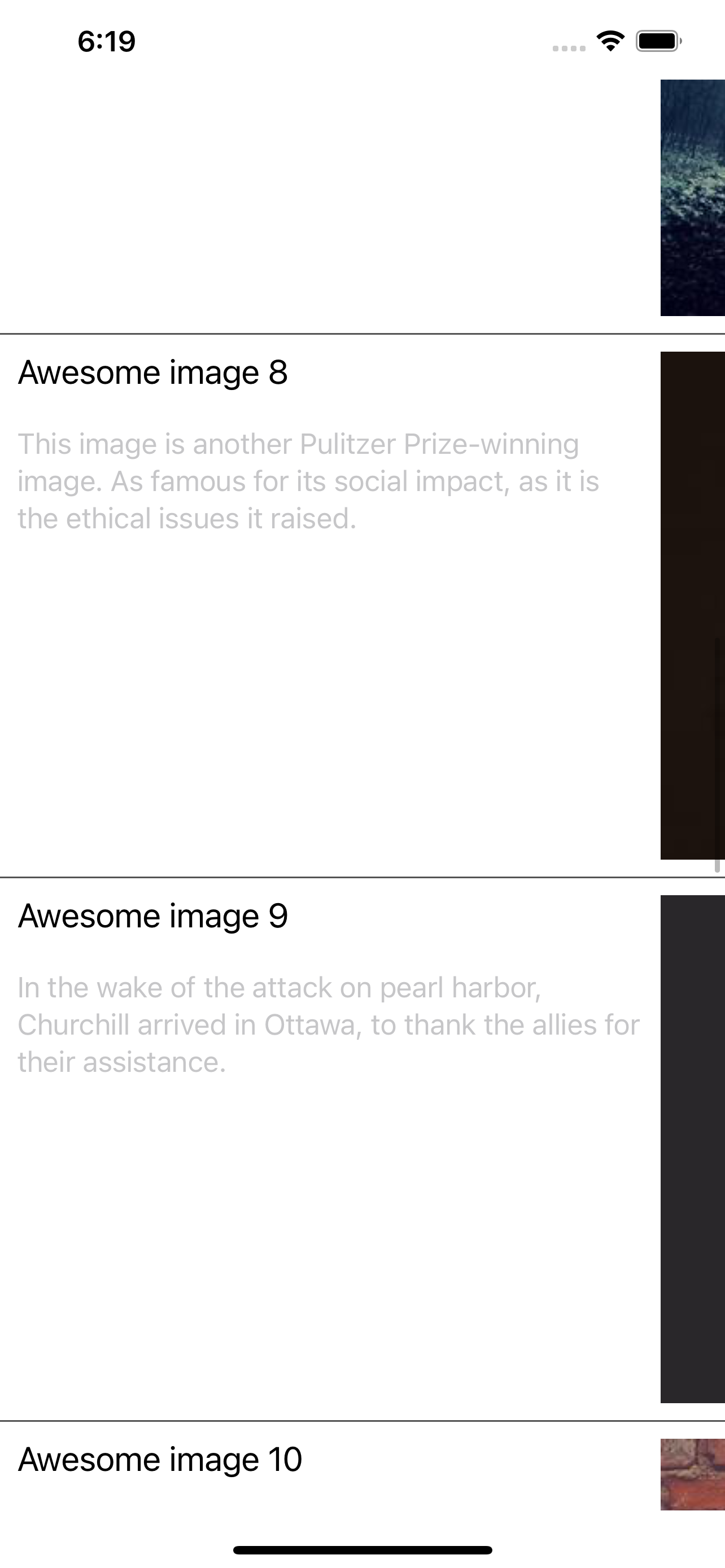 원래 오른쪽에 사진이 배치되어있는 형태여야 되는데 사진이 아예 프레임 밖을 벗어나고 일부만 보이는 현상이다. UICollectionView cell size not working이라는 키워드로 구글링을 해서 해결할 수 있었는데 swift5 혹은 xcode 11 이후부터는 UICollectionViewDelegateFlowLayout의 size 결정 메서드가 제대로 동작하기 위해서는 CollectionView의 Estimate Size 속성을 None으로 바꾸어 줘야 한다고 한다.