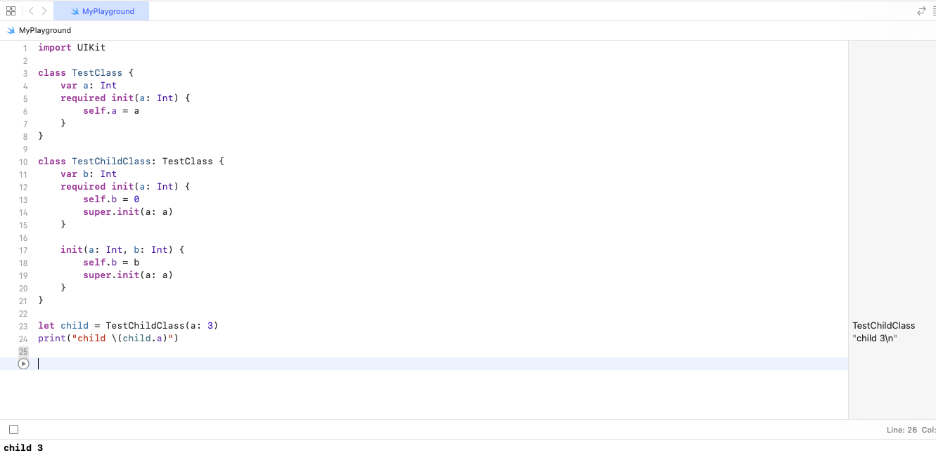 - 클래스의 initializer 앞에 required 키워드를 붙이면 해당 클래스를 상속받는 자식 클래스에서는 반드시 해당 initializer를 구현해야한다.