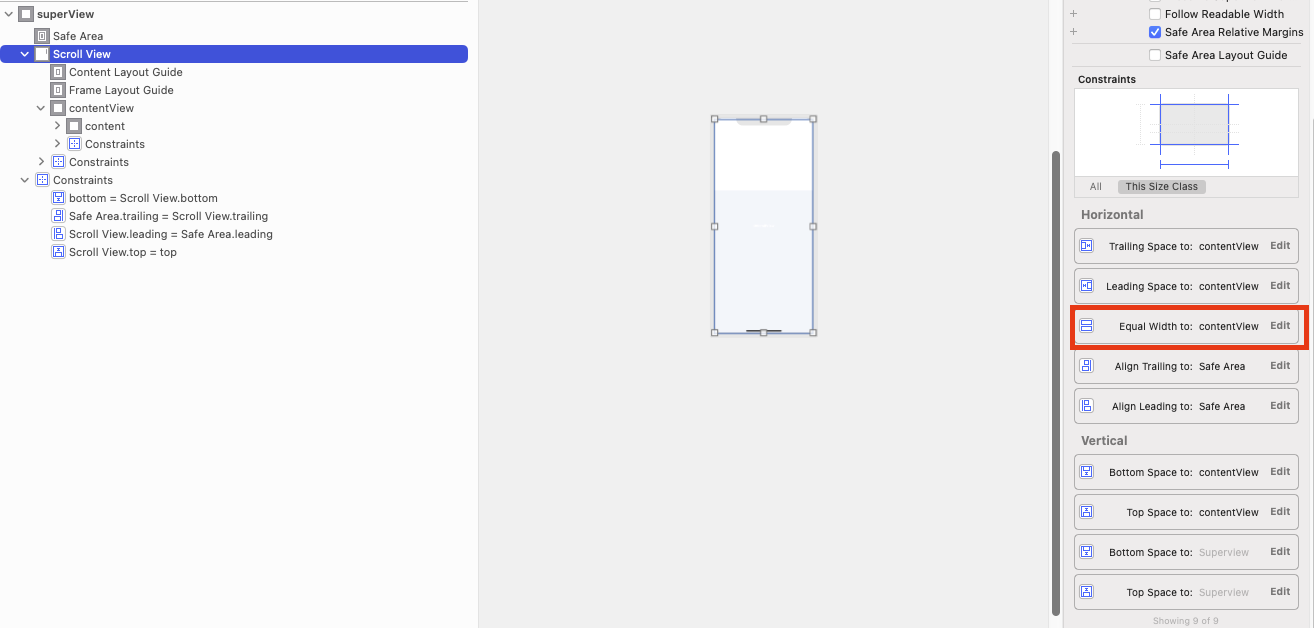 수직 스크롤과 정확히 반대로 ScrollView와 contentView 사이에 Equal Height옵션을 넣어주면 된다.