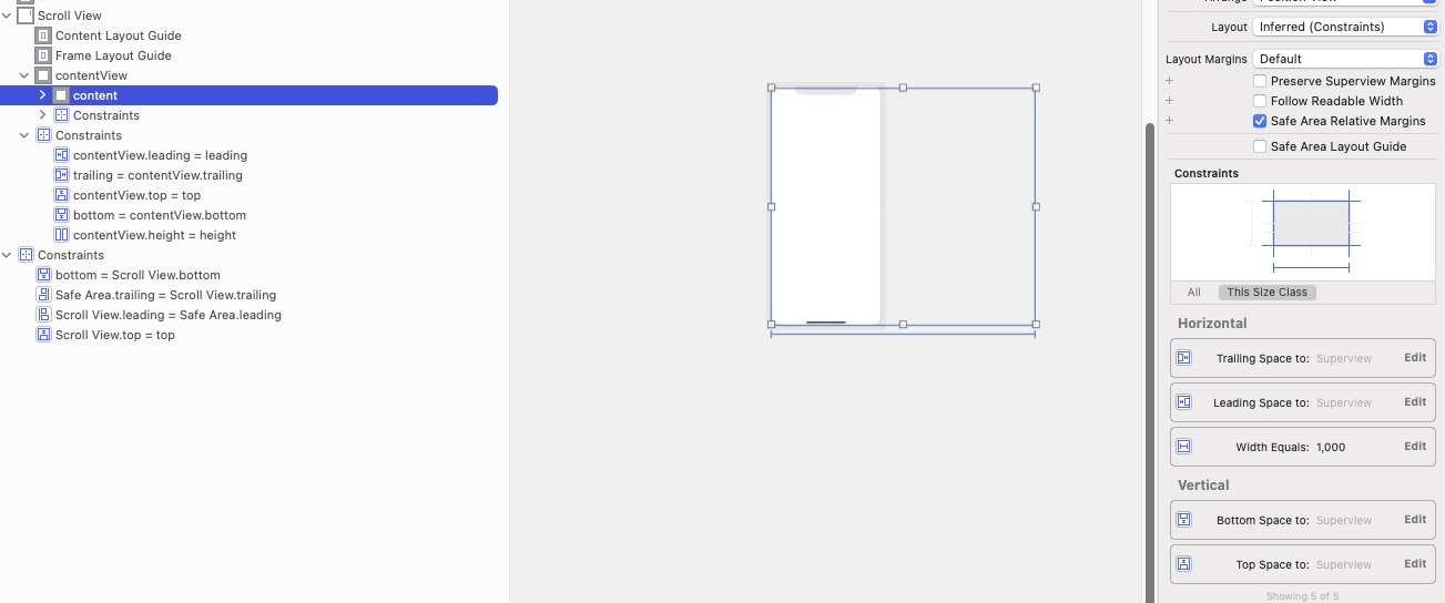 다음과 같이 UIScrollView와 그 내부의 contentView에 same width 제약을 추가하면 수직으로만 스크롤이 가능하다.