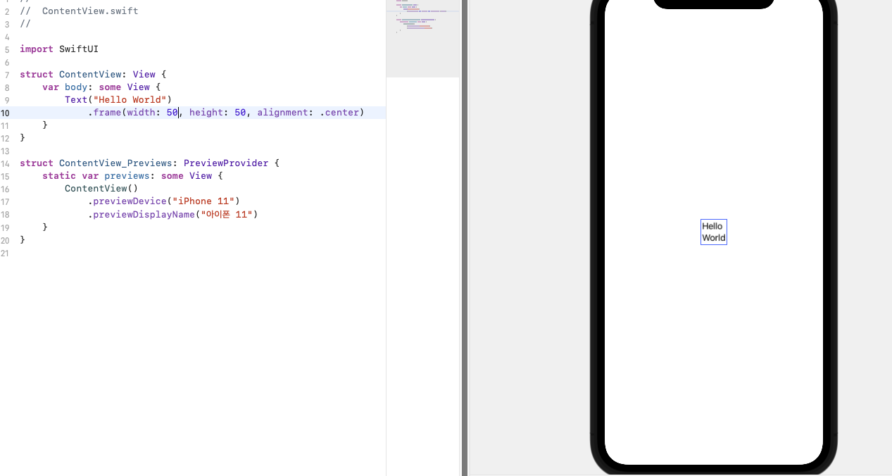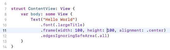 - 하지만 뷰 자체의 절대적인 크기나 영역을 지정할 필요가 있을 때는 frame 수정자를 통해서 지정 가능하다.