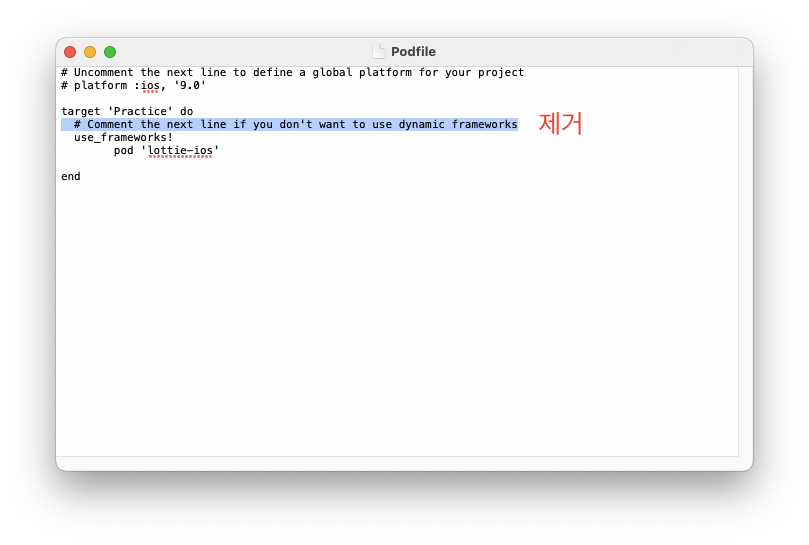Podfile의 중간에 있는 주석을 제거하고 pod install