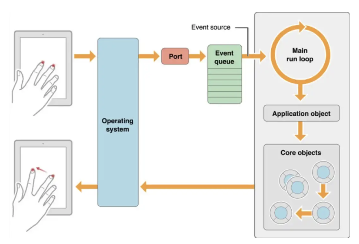 - Device에서 일어나는 user의 이벤트를 OS, Port를 거쳐서 Event Queue에 받은 뒤 UIApplication을 시작으로하는 UIResponder chain에 넘겨줘서 처리하도록 한다.